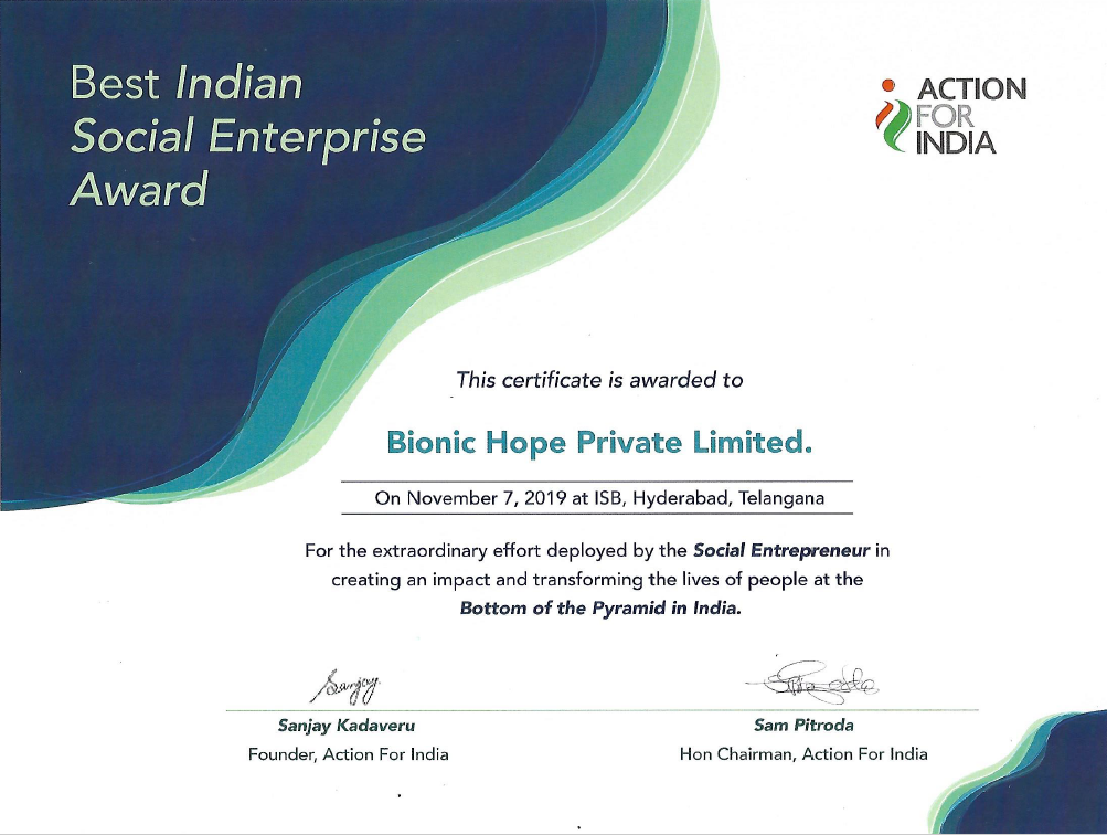 Action For India Congratulates team at Robo Bionics on Winning the AFI Best Indian Social Enterprise Award 2019.